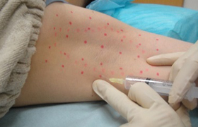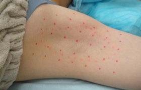 照射が終わりましたらクッション付き絆創膏を貼ります。治療後は、全体的に細かい赤味があり、1週間を目安に針跡が点状にかさぶたとなります。かさぶたは自然と剥がれ落ち、赤みや針跡は徐々に分かりにくくなります。生活制限はありませんので、治療後より通常通りの日常生活を過ごしていただけます。また、看護師より薬の説明や術後の注意事項をご案内させていただきます。