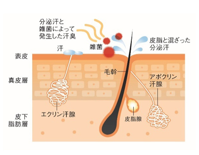 汗と臭いの元となる汗腺は「アポクリン汗腺」と「エクリン汗腺」の2種類があります。それぞれ皮下組織の異なる深さに存在していて、役割や性質も異なります。