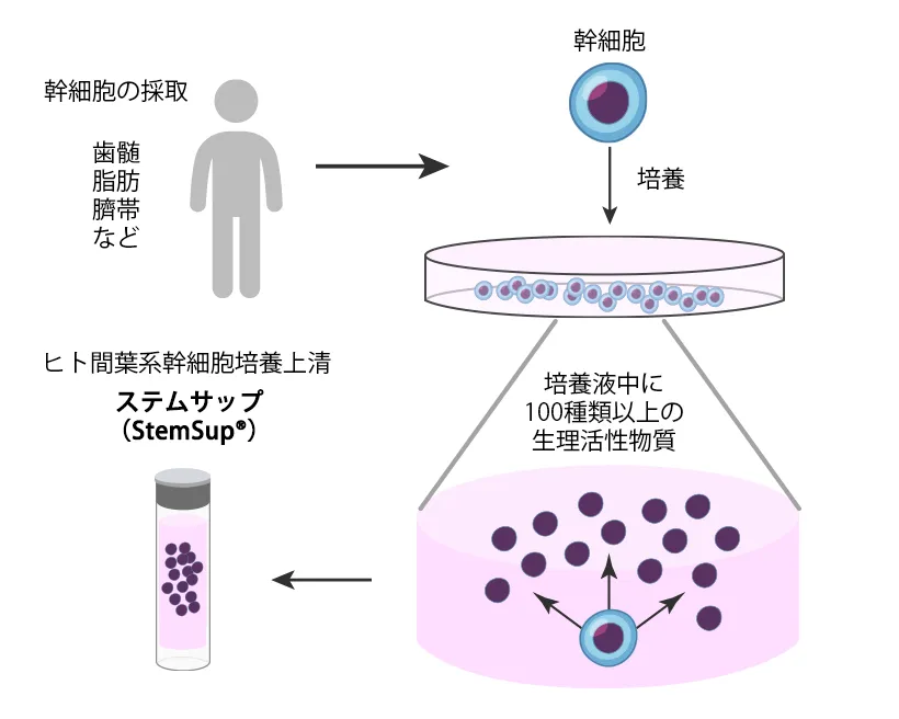 幹細胞培養上清液は人体に存在する幹細胞を培養し、さらにその培養液から幹細胞を取り出して滅菌等処理を行った上澄み液のことです。幹細胞培養上清液には2つの有効成分が含まれています。1つは、組織の再生・細胞の機能回復効果がある成長因子(サイトカイン)。もう1つは全身の細胞に働きかけ組織修復を促す効果があるエクソソームです。当院では株式会社日本バイオセラピー研究所のStemSup®という幹細胞培養上清液を採用しております。
