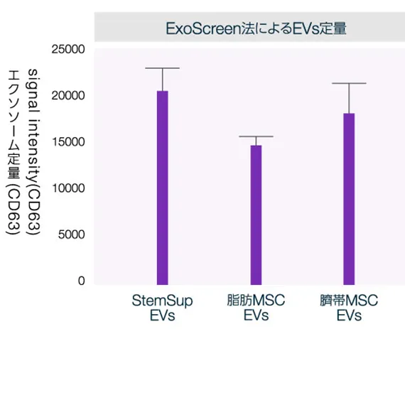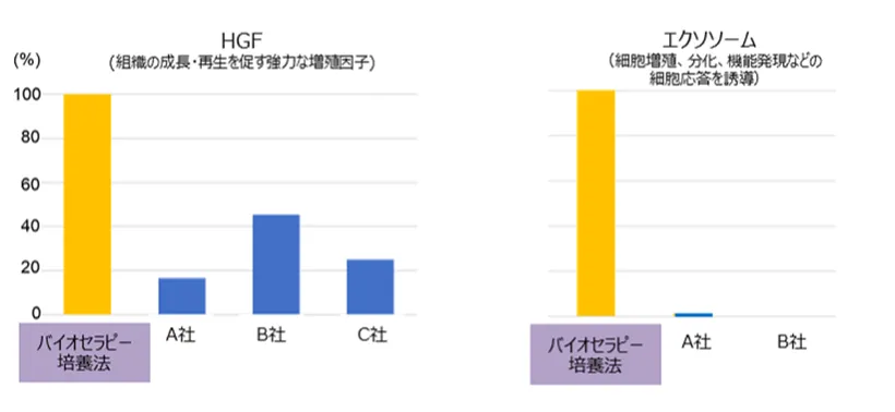 当院で採用している株式会社日本バイオセラピー社製造のステムサップ(StemSup®)は、最適化された独自のシステムで培養されており、組織の成長・再生を促す強力な増殖因子(HGF)は、他社製品と比較して2~5倍、さらに細胞増殖・機能発現などの細胞応答を誘導して組織修復を促すエクソソームは10~100倍も含まれていることがわかっています。