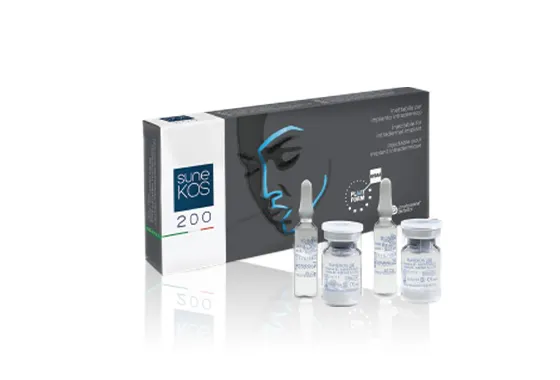 SUNEKOS(スネコス)はイタリア生まれの注射剤です。 主成分は非架橋結合ヒアルロン酸と6種類のアミノ酸が、国際特許取得の特殊な比率で配合されており、このバランスが皮膚の繊維細胞を刺激し、コラーゲンとエラスチン合成を促進させ、加齢からくるシワを改善させる、アンチエイジングの為のお注射です。
