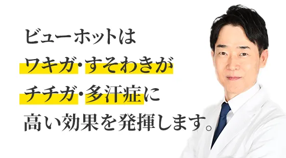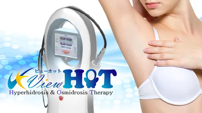 ビューホットはニオイ・汗の量ともに抑えることが可能な高周波照射のみの治療です。ニオイの原因となるアポクリン汗腺のある脇の下、乳輪周り、デリケートゾーンの治療が可能です。