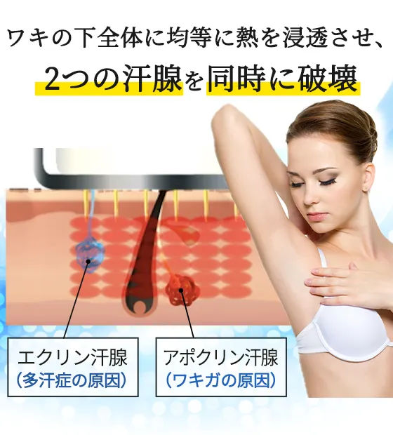 ワキの下全体に均等に熱を浸透させ、2つの汗腺を同時に破壊することで、汗・においそれぞれのお悩みを同時に解消する事が可能になりました。