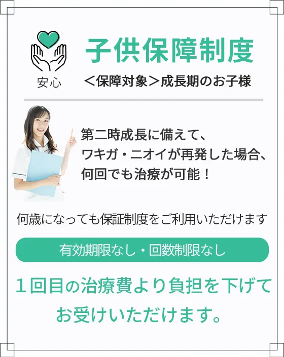 お子様のワキガ治療は、早めに治療されることをお勧めしています。ただ、ワキガの原因であるアポクリン汗腺は第二次成長期に増える傾向にあります。そのため、女子は16歳、男子は18歳未満のお子様の場合、治療をしてもその後の成長過程でアポクリン汗腺が増加するので、再発する可能性があります。