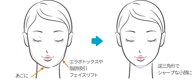 メスを使わず短時間であごの形を整えることができ、顔全体の印象が引き締まりフェイスラインがシャープな印象になります。また、フェイスラインがシャープになることで小顔に見える効果もあります。