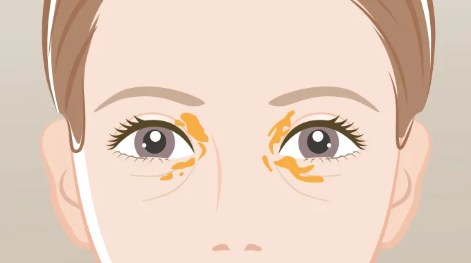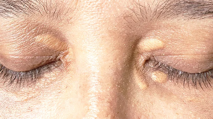 脂肪を含む組織球(白血球の一種)が増えてできる良性の腫瘍で、悪性ではありません。高コレステロールなどの脂質異常症と関連して発生することがありますが、コレステロールが高くなくても現れることがあります。