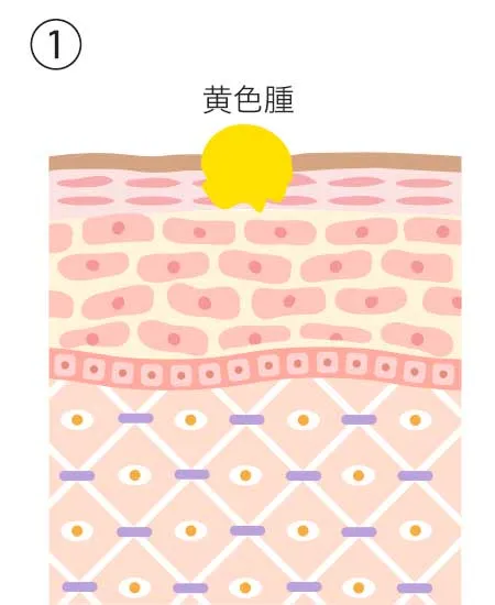 エルビウムヤグレーザーで黄色腫除去を行った場合、照射直後は一時的に患部が少し凹んだ状態になりますが1週間程かけて皮膚が平らに戻ります。その後、約3ヶ月ほどかけて徐々に患部の赤みや茶色みが落ち着ちついてきます。