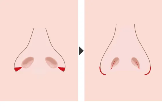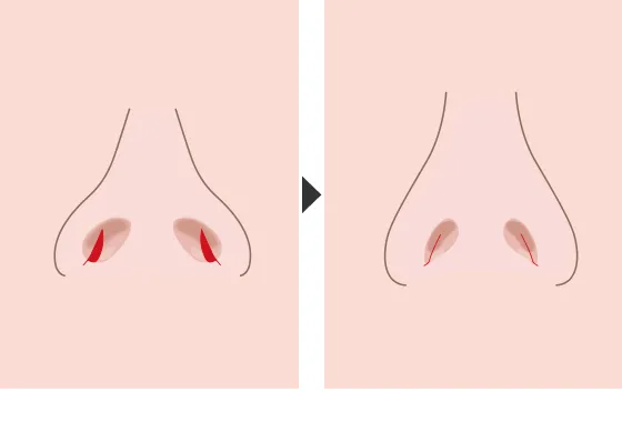 小鼻(鼻翼)の張りを改善したい方、しっかりとした変化を求められる方にお勧め左右の小鼻の付け根部分を外側から数ミリカットし、そこから不要な皮膚を取り除きます。