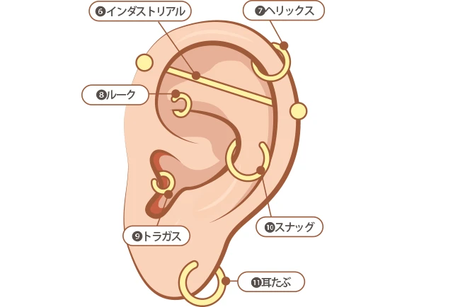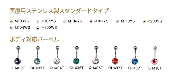 当院では、耳たぶ用、へそ用ピアスをご用意しています。耳たぶ、へそ以外の部位の穴あけをご希望の方は、お好きなピアスを持参ください。