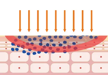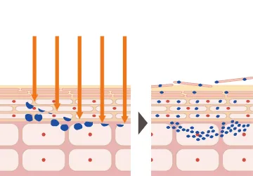 ピコレーザーで真皮層に残っている色素(刺青)に照射します。周囲の皮膚を傷つける事なく、色素細胞に反応します。従来のレーザーに比べ色素粒子をより細かく分解します。細かく破砕された色素は代謝排泄されます。